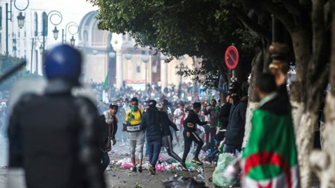 | Photo de heurts entre la police anti-émeutes algérienne et quelques manifestants, le 12 avril 2019 à Alger. |