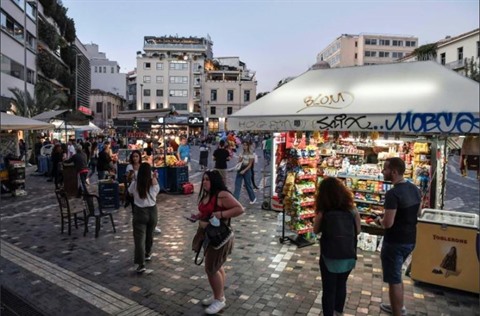 | Des kiosques dans un quartier touristique et fréquenté d'Athènes, le 9 octobre 2020. |