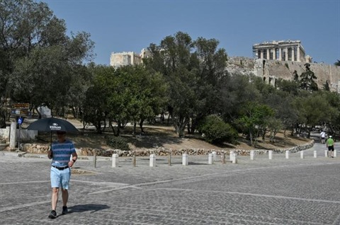 | Un touriste se protège de la chaleur, au pied de l'Acropole d'Athènes en Grèce, le 2 août. |