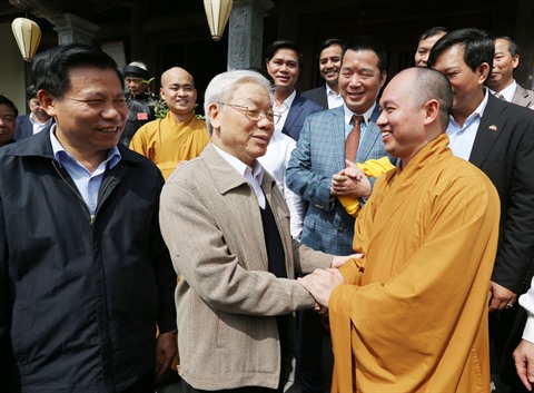 | Le secrétaire général du PCV, Nguyên Phu Trong (centre), avec le bonze supérieur Thich Duc Thiên, secrétaire général du Conseil d’administration de l’Église bouddhique du Vietnam et gérant de la pagode Phât Tich à Bac Ninh |