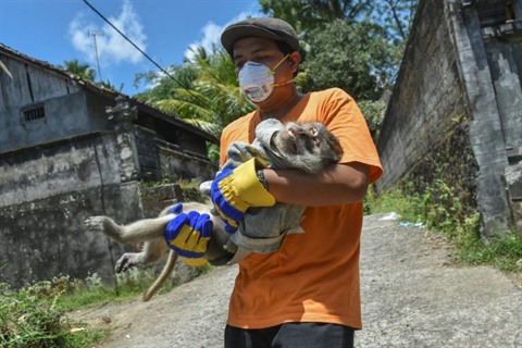 Un membre d'une ONG porte un singe évacué de la maison d'un villageois à Sidemen, près du Mont Agung, le 29 septembre. Photo : AFP/VNA/CVN |