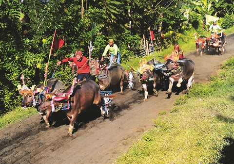 Agglutinés le long du parcours, des centaines de spectateurs acclament leur tandem favori, espérant qu’il va remporter cette compétition prestigieuse pour la communauté locale, organisée au cours du festival annuel sur l’île la plus touristique d’Indonésie.