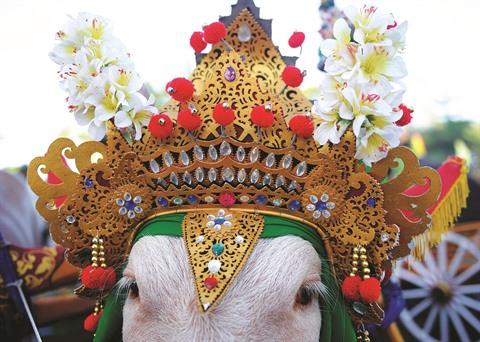 | Une coiffure ornementale d’un buffle participant à un Makepung. |