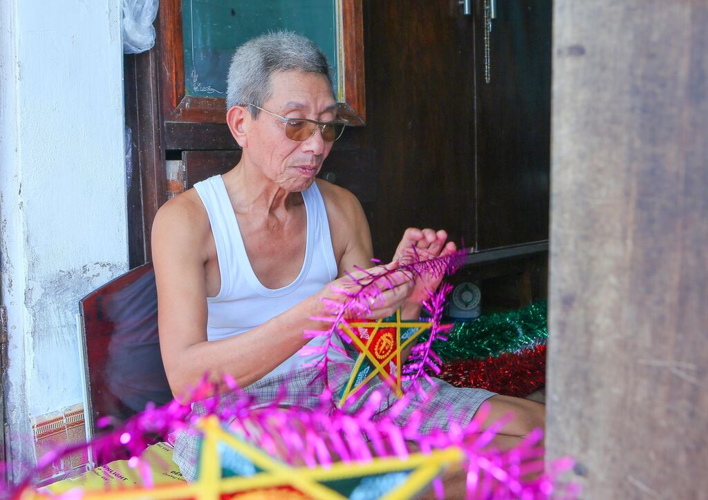 | À 65 ans, Bùi Van Huân continue de fabriquer des lanternes étoilées traditionnelles. |