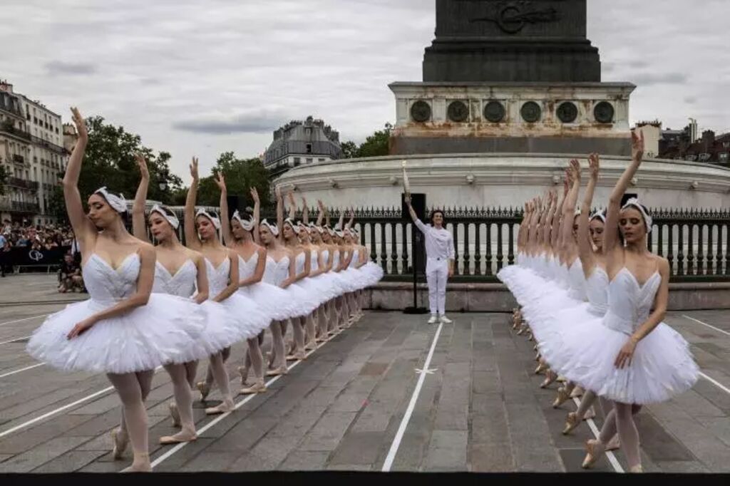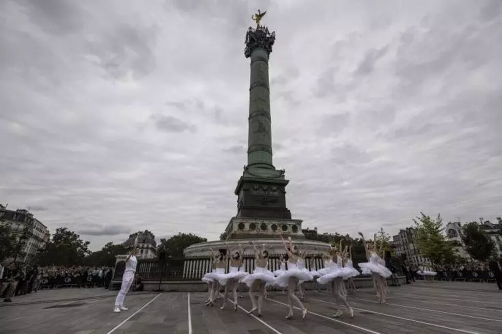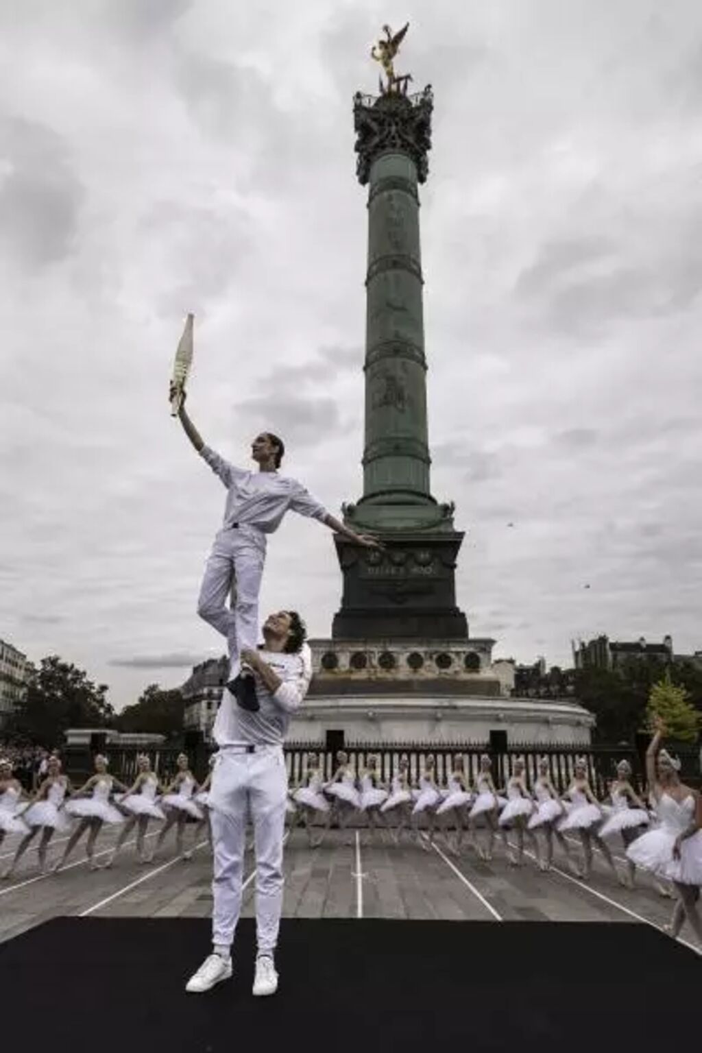 Jetés, pliés, arabesques et grands battements ont dû s'interrompre lorsque le danseur étoile Hugo Marchand a fait une entrée triomphale, vêtu de blanc et brandissant la torche olympique, acclamé par le public, venu nombreux assister à l'événement au pied de la Colonne de Juillet.
