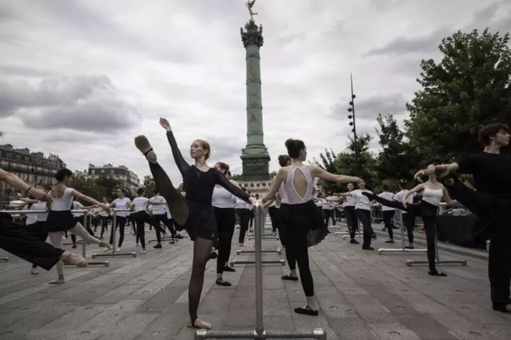 Une cinquantaine de barres fixes, comme en studio, avaient été installées sur la place où le cours de danse a repris, en cadence et avec application, sous la direction du professeur de ballet de l'Opéra, Andrey Klemm, et au son du piano de Naruko Tsuji dans un répertoire classique ponctué d'Erik Satie, Leo Delibes et Edith Piaf.