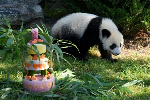 | Le bébé panda Yuan Meng, un an, découvre son gâteau d'anniversaire dans son enclos du zoo de Beauval, le 4 août en France. |