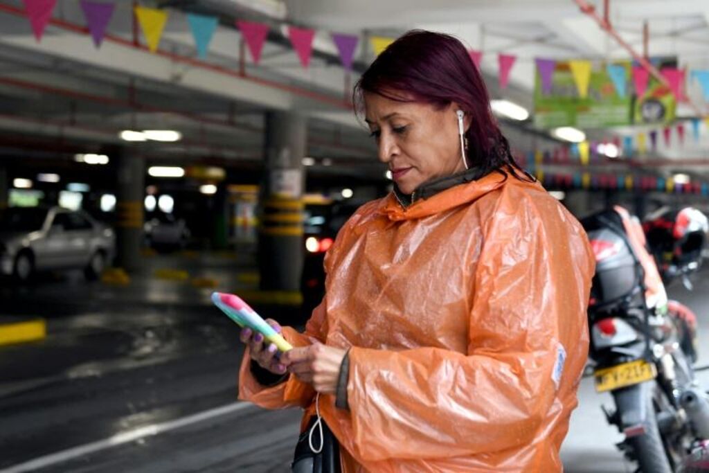 | Luz Miryam Fique, 57 ans, coursière à moto et présidente de l'Union des travailleurs de la plateforme numérique (UNIDAPP), effectue une livraison à Bogota le 5 octobre. |