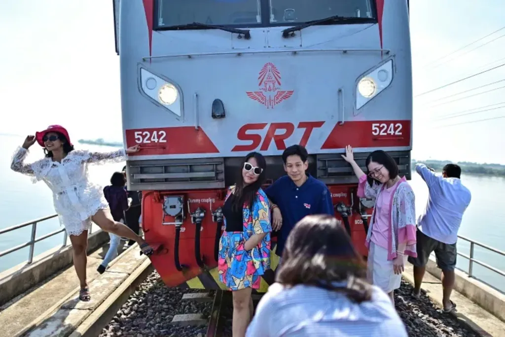 Trois heures et demie après avoir quitté Bangkok, le train japonais réaménagé, constitué de plus d'une dizaine de wagons, traverse le réservoir de Pasak Jolasid par une série de viaducs puis s'arrête pendant 20 minutes pour une pause selfie.