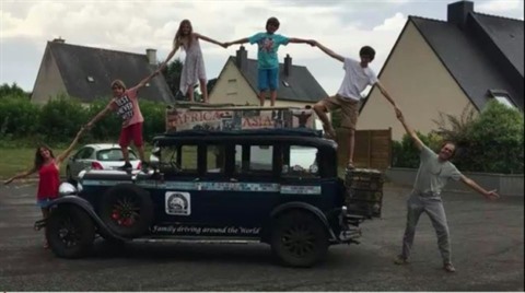Avec son moteur grinçant, la berline américaine n'est plus de première jeunesse. À Montauban-de-Bretagne, près de Rennes où la famille a fait halte, les curieux s'attroupent autour de la voiture qui est coiffée d'une tente sur son toit. Un autocollant "Family driving around the world" ("une famille conduisant autour du monde") entoure le véhicule.