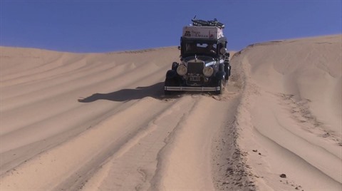 | Capture d'image d'une vidéo de l'AFPTV montrant La famille Zapp et leur berline Graham-Paige de 1928 dans le désert d'Atacama. |