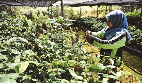 | Une travailleuse prend soin des plants donnés par d’anciens bûcherons pour le traitement médical et le reboisement à Manjau, province du Kalimantan occidental, en Indonésie. |