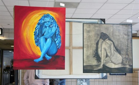 Antoinette Alcazar a apporté cinq tableaux, dont un intitulé "Submergée" où l'on voit une femme peinte en bleue, assise recroquevillée dans une position fœtale, le monde autour d'elle éclatant en bruyantes tonalités rouges et dorées.