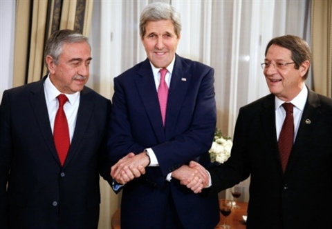 | le secrétaire d'État américain, John Kerry (centre), serre la main au président chypriote Nicos Anastasiades (droite) et au président turc chypriote, Mustafa Akinci, le 3 décembre à Nicosie. |