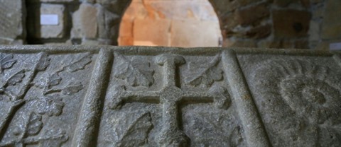| La croix des Templiers sur un sarcophage du XIVe siècle, au château médiéval de Limassol, à Chypre, le 22 janvier 2021. |