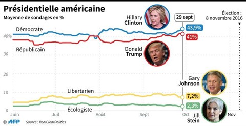 Au niveau national, Hillary Clinton (68 ans) était créditée lundi 3 octobre de 43,8% des intentions de vote contre 41% pour Donald Trump et 7,2% pour le candidat libertarien Gary Johnson, selon la moyenne des derniers sondages calculée par Real Clear Politics.