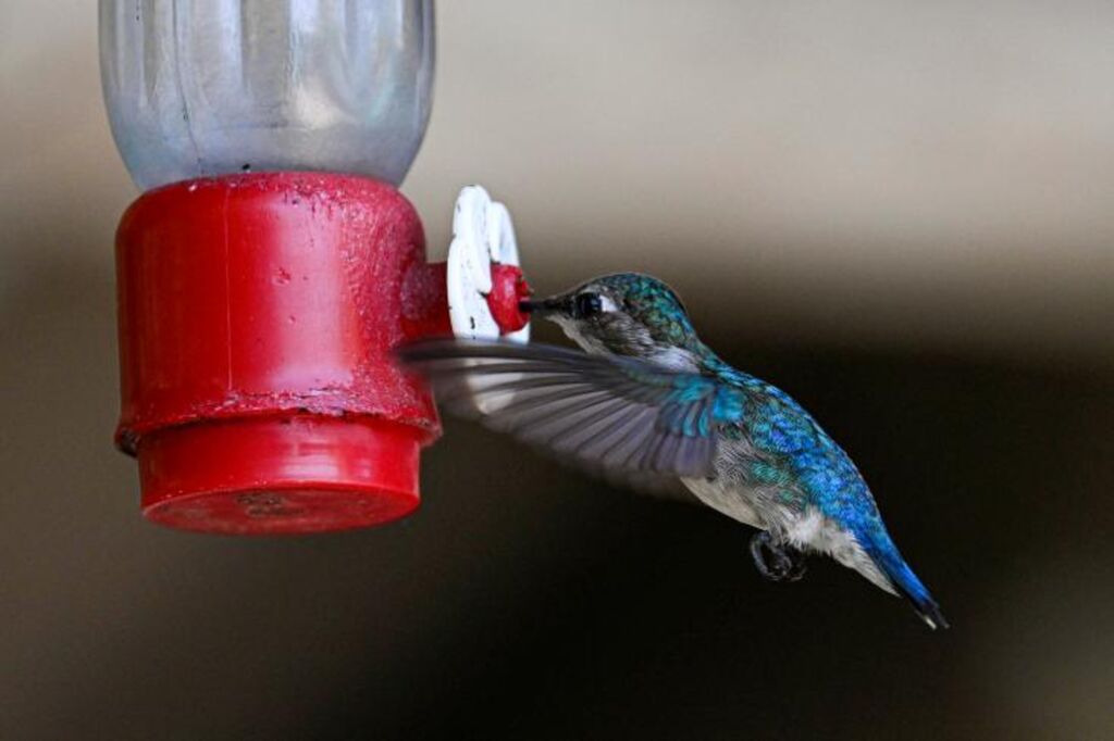 | Un oiseau-mouche vient boire à un petit abreuvoir rempli d’eau et de sucre dans le jardin de Bernabe Hernandez, à Cuba. |