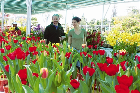 | Des touristes visitent une ferme de floriculture utilisant de hautes technologies. |