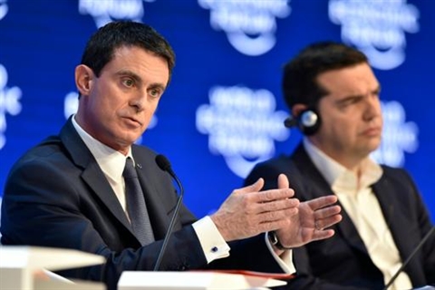 | Les Premiers ministres français Manuel Valls et grec Alexis Tsipras, le 21 janvier à Davos. |
