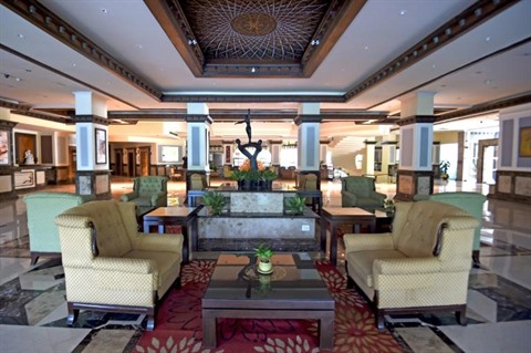 | Le lobby désert de l'hôtel de luxe Suryaa, le 19 juin à New Delhi, en Inde |