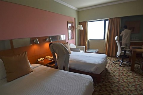 | Des employés nettoient une chambre de l'hôtel de luxe Suryaa, le 19 juin à New Delhi, en Inde. |