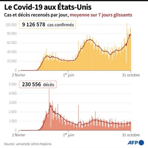 | Graphique montrant les nouveaux cas et décès du COVID-19 aux États-Unis, au 1er novembre. |