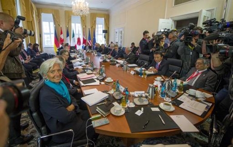 | La directrice générale du FMI Chritine Lagarde (gauche) et les ministres des Finances et les gouverneurs des banques centrales du G7, avant le début de leur réunion du 28 mai à Dresde, dans l'Est de l'Allemagne. |