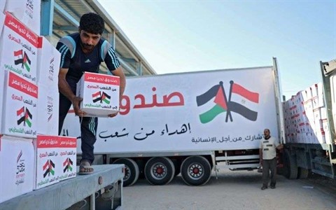 | Un camion égyptien transportant une aide humanitaire déchargé à Gaza, le 23 mai. |