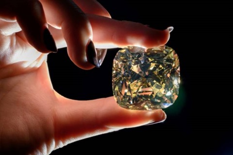| Le diamant jaune "The Red Cross Diamond", présenté à Genève le 6 mai, avant sa mise aux enchères, le 11 mai. |