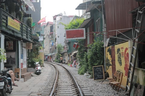 La voie ferrée traverse les rues très étroites du vieux quartier de la capitale vietnamienne, bordées de bâtiments de l'époque coloniale, de temples bouddhistes ou de pagodes entassés les uns à côté des autres.