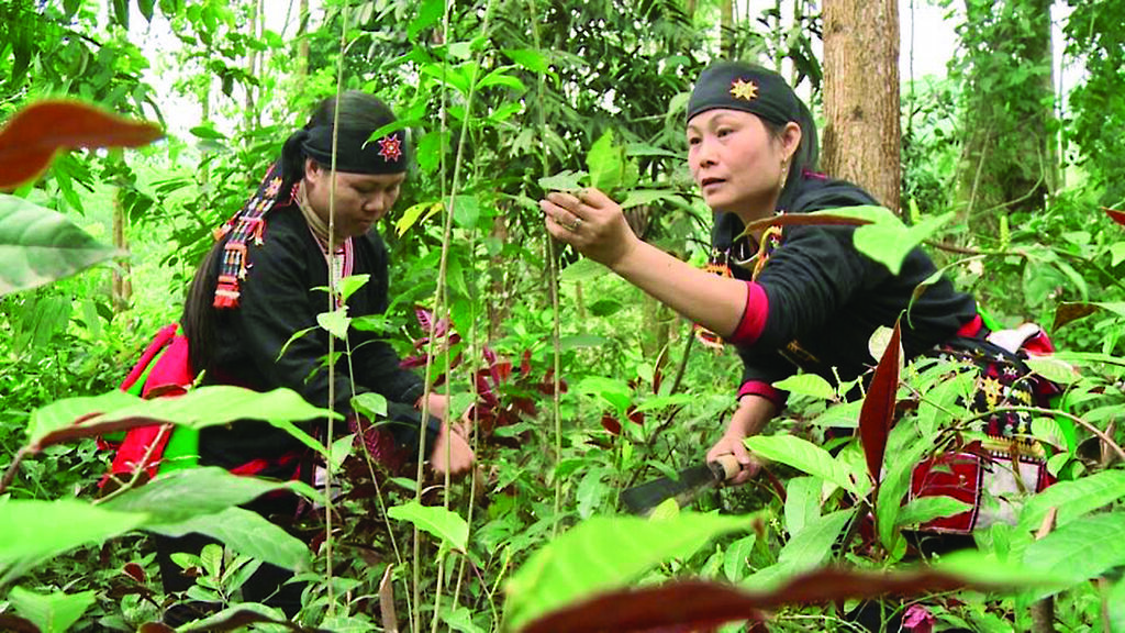 | Deux femmes de l’ethnie Dao récoltent des herbes médicinales. |