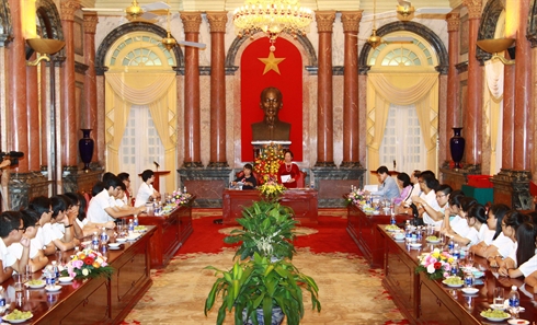 | La rencontre entre la vice-présidente du Vietnam, Nguyên Thi Doan, et la délégation de 41 excellents élèves, le 2 novembre à Hanoi. |