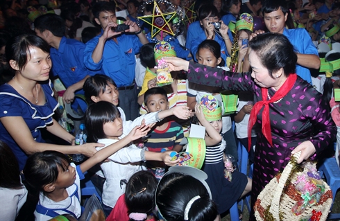 | La vice-présidente Nguyên Thi Doan (droite) offre des cadeaux aux représentants d'enfants des arrondissements et districts de Hanoi. |
