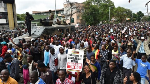 | Des manifestants au côté d'un transport de troupes de l'armée zibabwéenne le 18 novembre 2017 lors d'une manifestation pour réclamer le départ du président Robert Mugabe. |