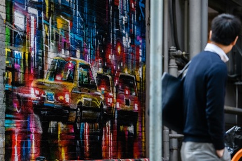 L'artiste vient d'achever de peindre un marché de rue avec force détails dans le quartier d'affaires de Wan Chai avant de passer au mur d'un troquet de Central, au cœur de la mégapole. Juste en face du bar se trouve une fresque emblématique, réputée être le mur le plus photographié de la ville, signée par Alex Croft. Elle reproduit des rangées de maisons anciennes sur un fond bleu vif.