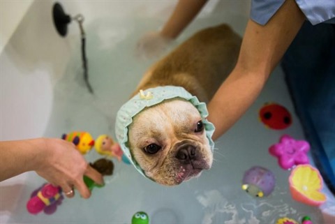 | Un bulldog français lavé dans un salon de toilettage de Hong Kong, le 3 février 2018. |