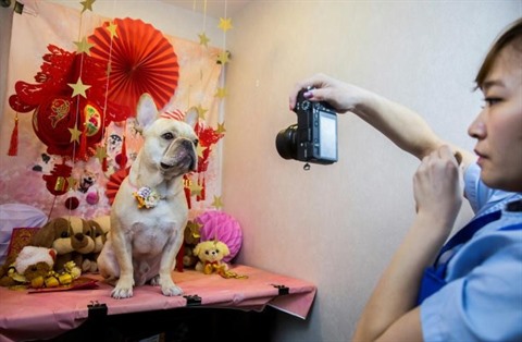 | Pour l'Année du Chien, chaque "parent" achetant un traitement se voit offert un portrait de son toutou entouré de peluches et d'objets de décoration rouge et or. |