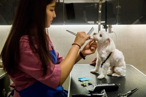 | Un chien brossé dans un salon de toilettage de Hong Kong, le 3 février. |