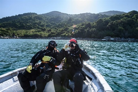 | Des scientifiques de l'Université de Hong Kong se préparent à plonger dans les eaux du parc marin de Hoi Ha Wan à Hong Kong, le 2 février. |