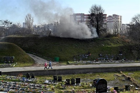 | Vue du crématorium de Kiev, où les crémations ont doublé, conséquence de la nouvelle vague de COVID-19, le 11 novembre. |