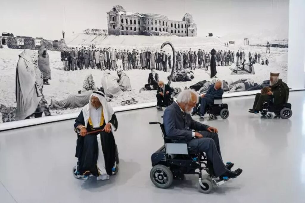 Dans la même salle, les visiteurs sortent immanquablement leur smartphone : 13 fauteuils roulants automatiques transportent des vieillards sculptés, hyperréalistes et grandeur nature, formant une chorégraphie macabre. Ils sont l’œuvre du duo d'artistes chinois Sun Yuan et Peng Yu.