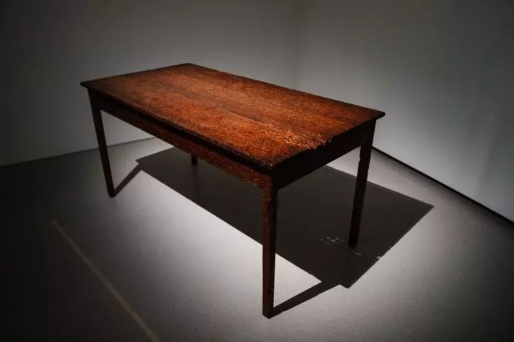 | La "Tabula Rasa", table entièrement pulvérisée et reconstituée par l'artiste colombienne Doris Salcedo à la Bourse du Commerce - Collections Pinault, le 13 mars à Paris. |