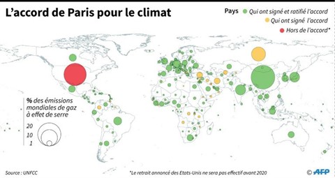 | Pays qui ont signé, ratifié ou qui sont hors de l'accord de Paris pour le climat, en fonction de leur poids dans les émissions mondiales de gaz à effet de serre |