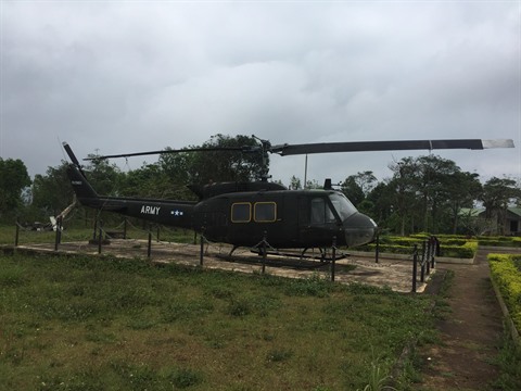 | Un hélicoptère américain exposé au musée des vestiges de guerre à l'aéroport de Tà Con. |
