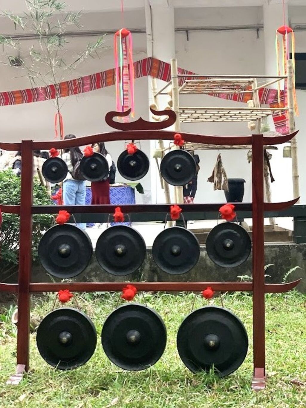 | Gongs des Muong exposés en plein air au Musée d’ethnographie du Vietnam. |