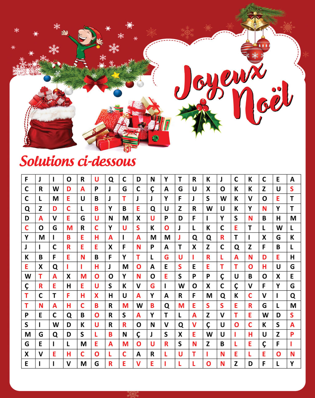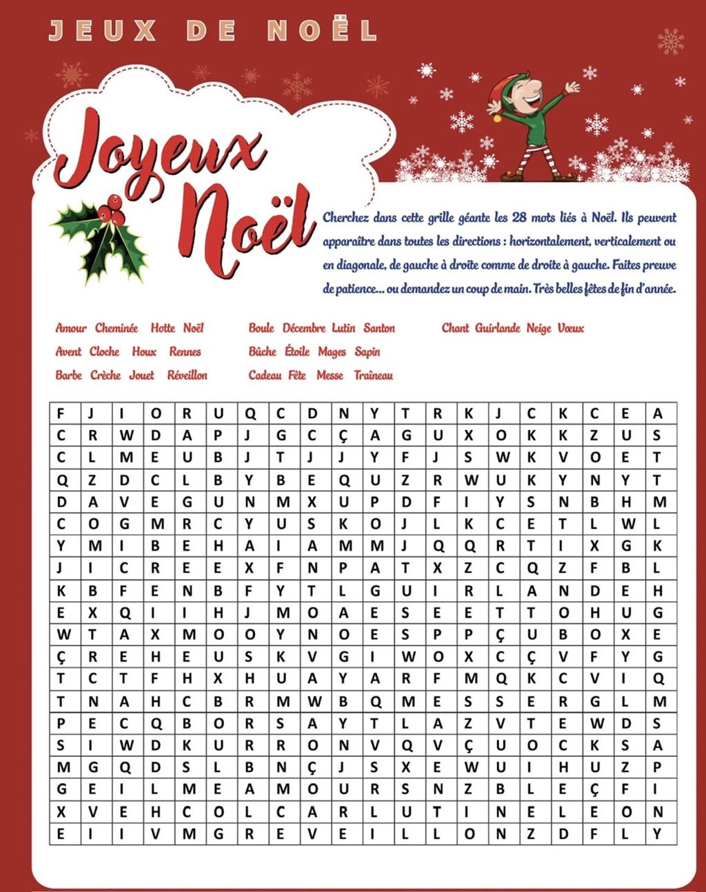 Cherchez dans cette grille géante les 28 mots liés à Noël. Ils peuvent apparaître dans toutes les directions : horizontalement, verticalement ou en diagonale, de gauche à droite comme de droite à gauche. Faites preuve de patience… ou demandez un coup de main. Très belles fêtes de fin d’année.