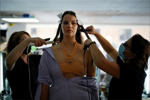| Un mannequin est coiffée avant les défis de la Fashion Week de Londres, le 17 septembre 2021. |
