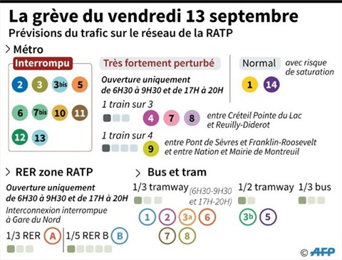 | Prévisions des perturbations sur le réseau RATP pour la grève du 13 septembre contre la réforme des retraites qui supprime le régime spécial de la RATP. |