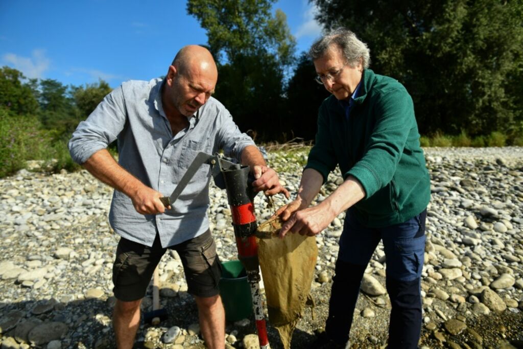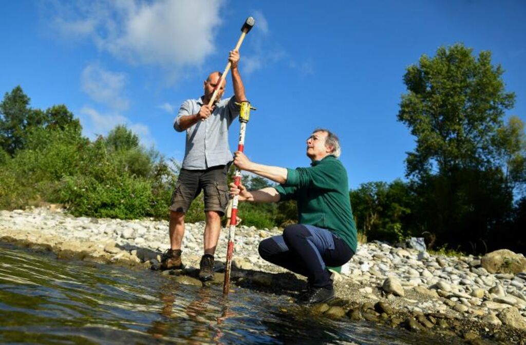 Sur une plage de galets des rives du Gave de Pau, le biologiste François Lefebvre et son collègue hydrogéologue Thierry Alezine frappent avec une masse sur une longue tige de métal, aux allures de barre à mine creuse et percée de trous, pour l'insérer profondément dans l'eau à fleur de rivière.