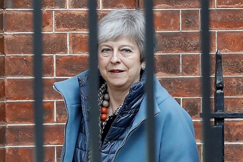 | La Première ministre britannique Theresa May quittant le 10 Downing Street à Londres par l'arrière du bâtiment, le 1er avril. |